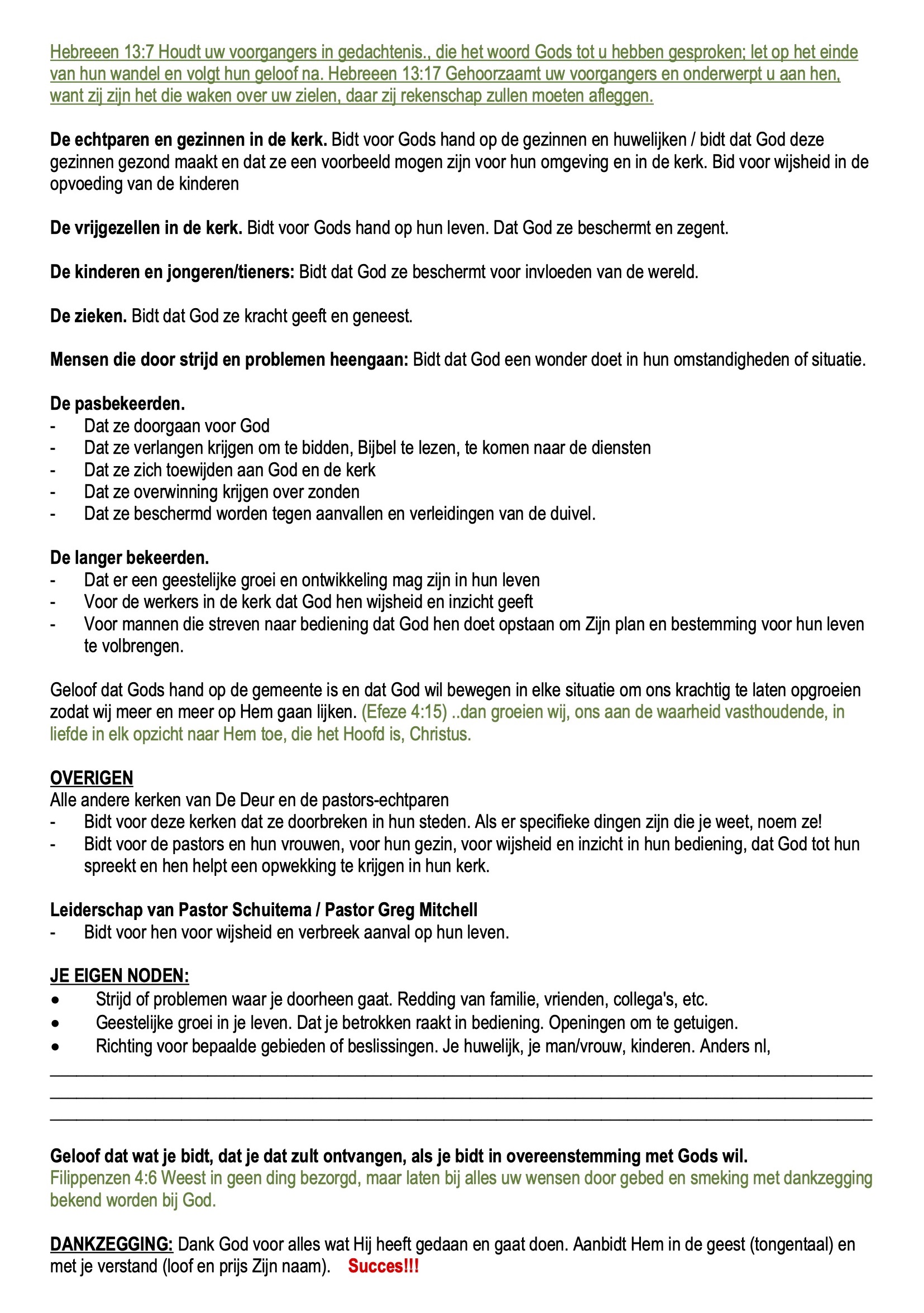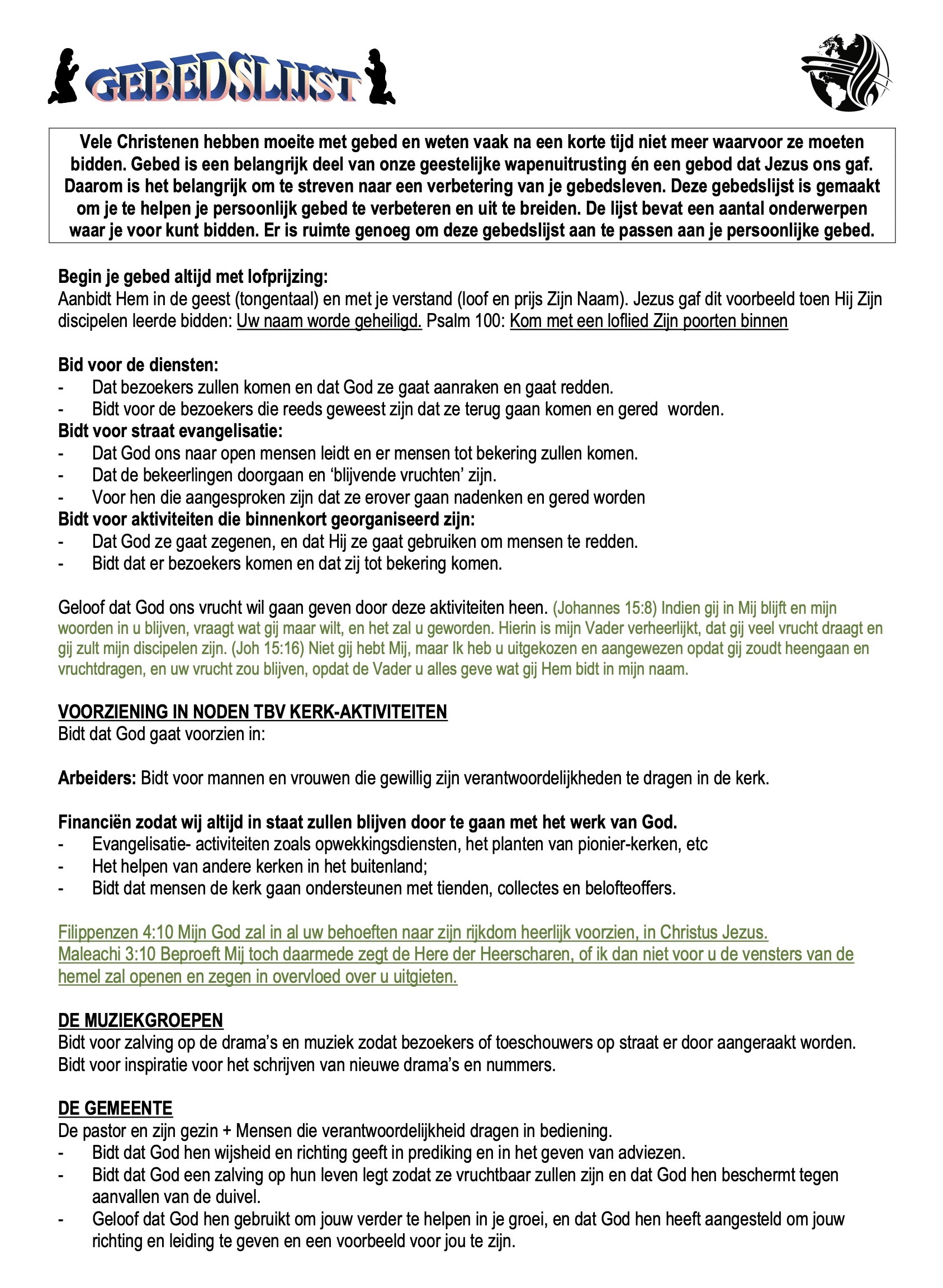 Om je te helpen met je gebed hebben we een gebedslijst gemaakt. Deze is om je te helpen je persoonlijk gebed te verbeteren en uit te breiden. De lijst bevat een aantal onderwerpen waar je voor kunt bidden. Er is ruimte genoeg om deze gebedslijst aan te passen aan je persoonlijke gebed. Klik hier voor pagina 1 en hier voor pagina 2 van de gebedslijst